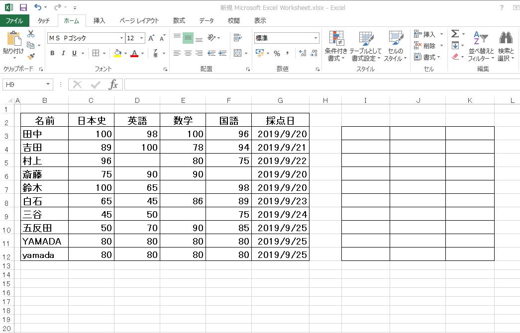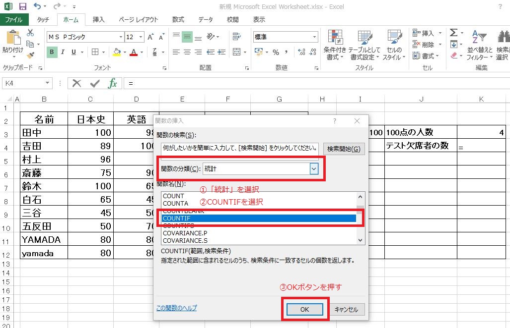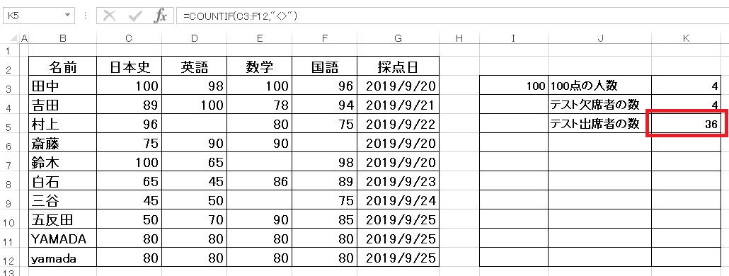 以下では、学習塾のテストの採点表を作成したという設定で、具体的にCOUNTIF関数の使い方を説明していきます。