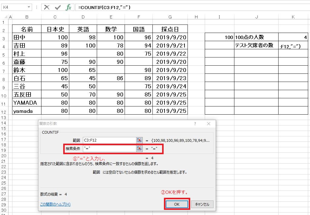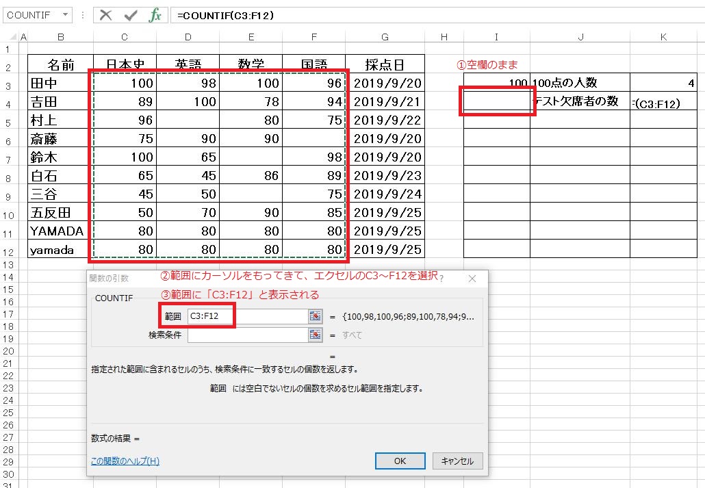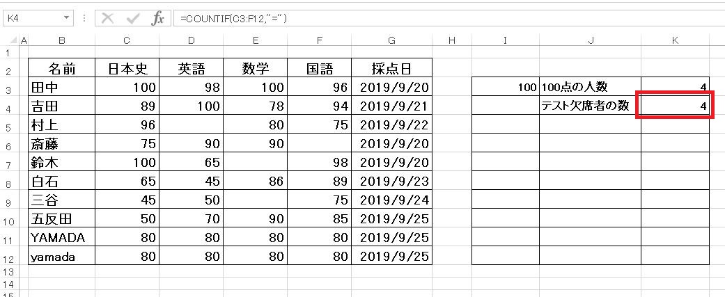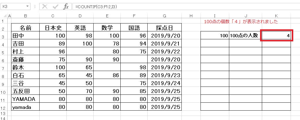 計算式は「=COUNTIF(C3:F12,I3)(又は=COUNTIF(C3:F12,100))」となります。
