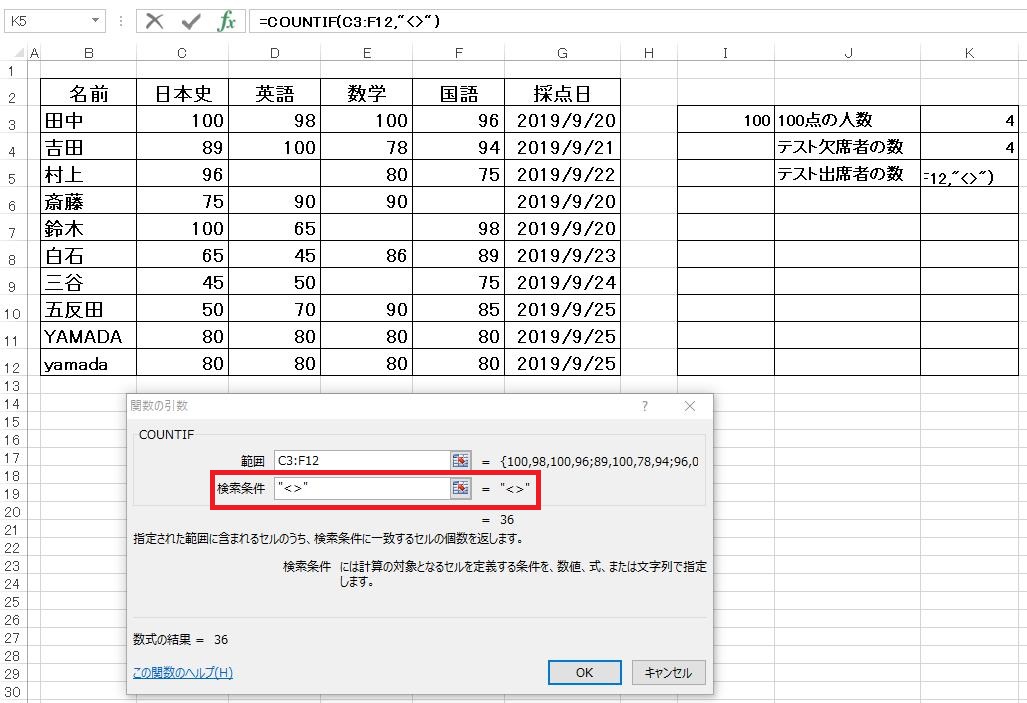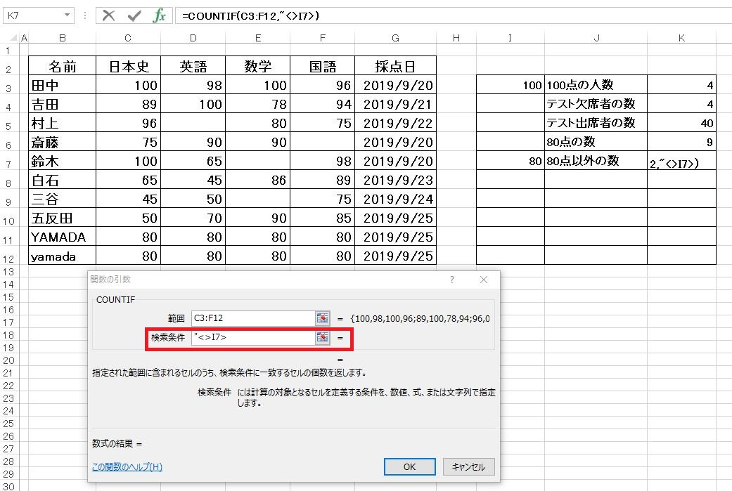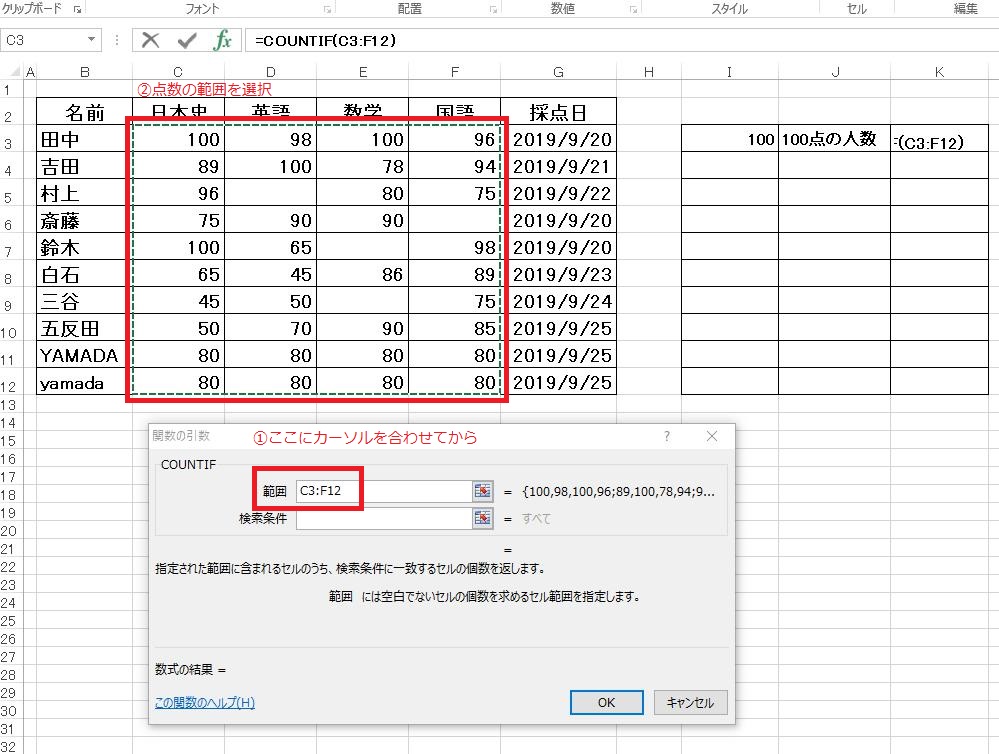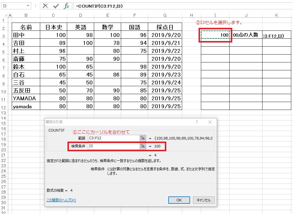 生徒名、教科を問わずにとにかく100点の数を求めたいので、任意の場所(ここではI3セル)に数値の「100」を入力し、範囲に表の点数のセル全てを設定します。