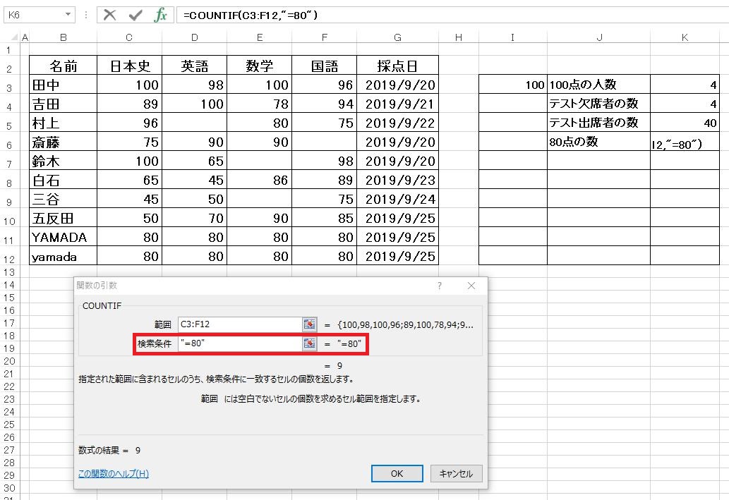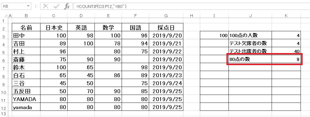 ここでは80点の数(一致・等しい)、80点以外の数(不一致・等しくない)の数え方を紹介します。