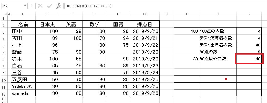 次に80点以外の数をカウントします。