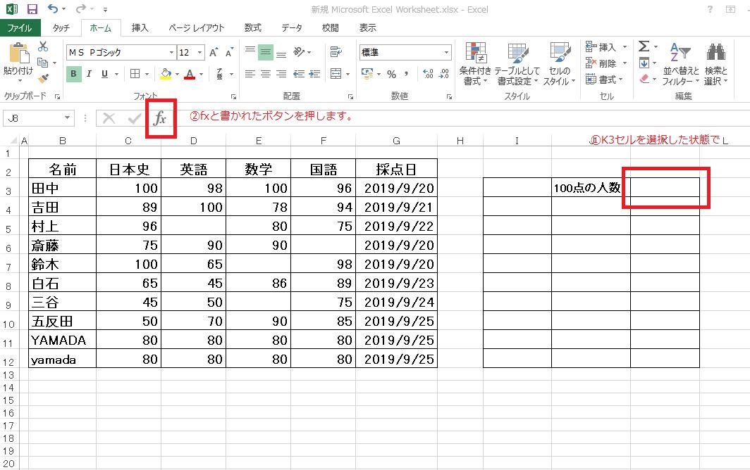 K3セルを選択した状態で、fxボタンを押します。