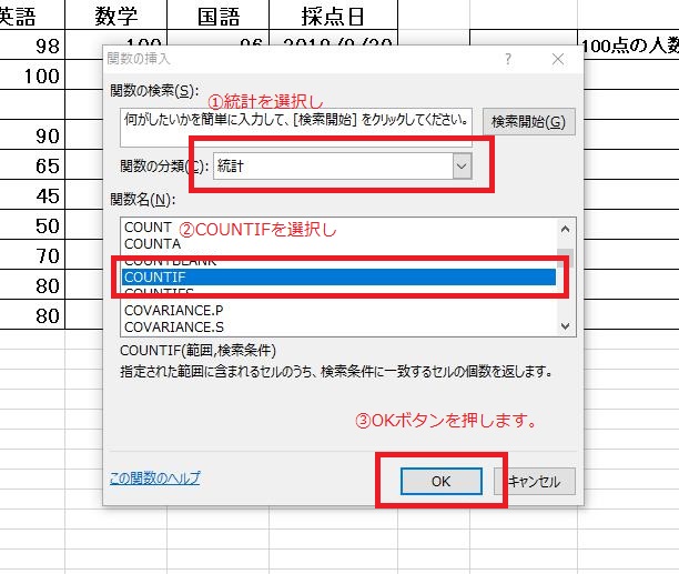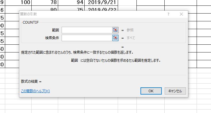 関数の分類(C)は「統計」を、関数名(N)は「COUNTIF」を選択し、OKボタンを押します。