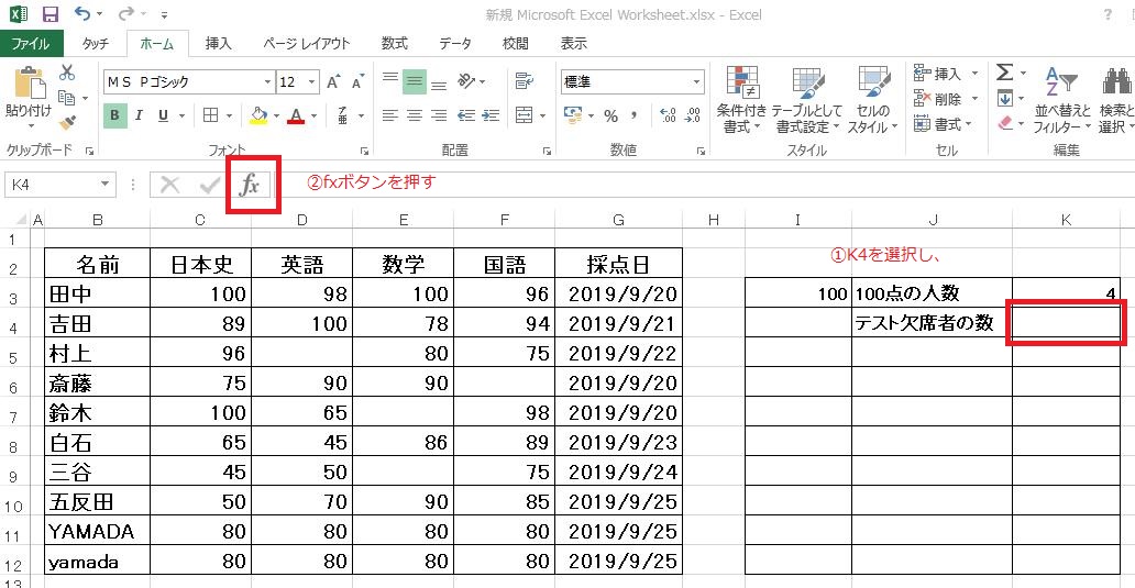 K4セルを選択し、「fx」ボタンを押します。