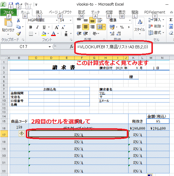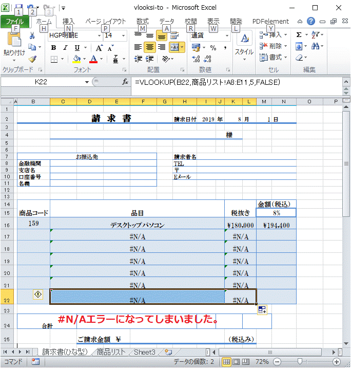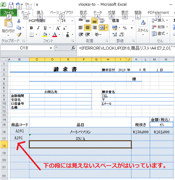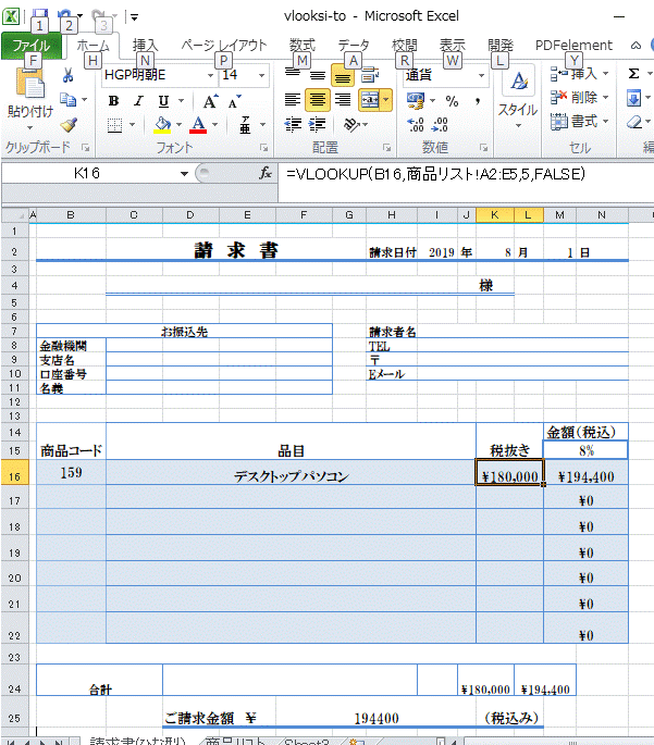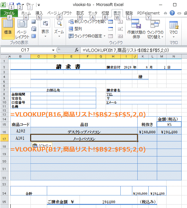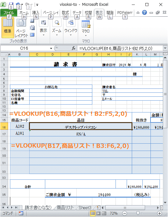 VLOOUP関数を使った例として請求書のテンプレートを作成しました。