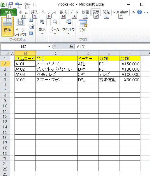 商品リストシートの商品コードが数字ではなく文字列である場合を想定します。