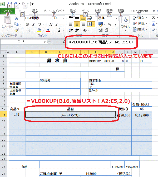 これは請求書のテンプレートの品目の一段目、C16のセルにあらかじめVLOOKUP関数の式(=VLOOKUP(B16,商品リスト!A2:E5,2,0))が入力されているからです。