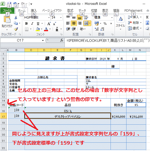 商品リストシートの商品コード「159」は数値として入力しています。